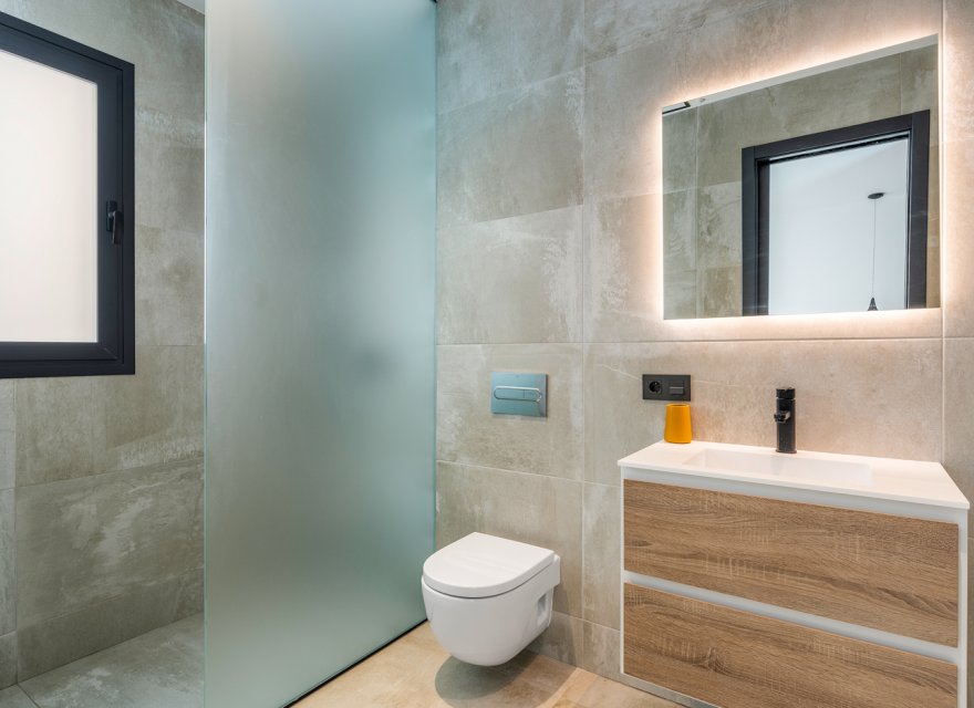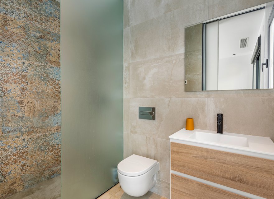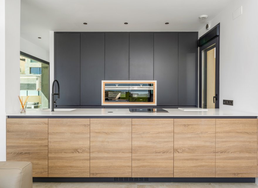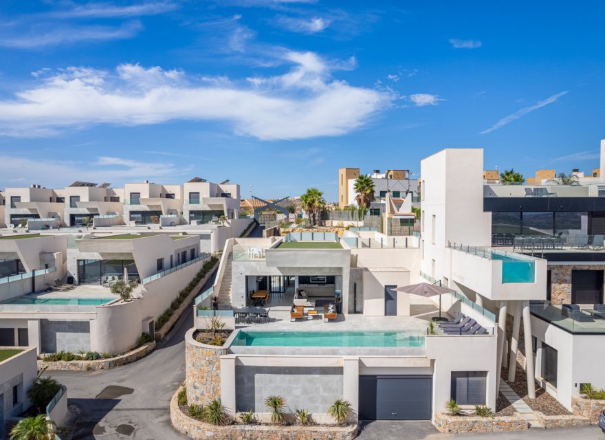 Luksusowa willa z 5 sypialniami i 6 łazienkami z widokiem w Ciudad Quesada. Piękna, luksusowa willa o łącznej powierzchni mieszkalnej 333 m², podzielona na dwa poziomy. Składa się z 5 sypialni dwuosobowych, wszystkie z łazienkami en-suite, dodatkowej łazienki i toalety dla gości. Parter składa się z dwóch sypialni z łazienkami en-suite, toalety dla gości oraz pięknej, otwartej kuchni, salonu i jadalni. W salonie znajdują się duże, całkowicie otwierane drzwi przesuwne, które zapewniają doskonałe połączenie przestrzeni wewnętrznej i zewnętrznej. Dolny poziom składa się z trzech sypialni z łazienkami en-suite, kuchni i pomieszczenia gospodarczego, dużego salonu, łazienki i dwóch schowków. Pokoje na tym poziomie mają dostęp do uroczego patio. Z salonu na tym poziomie jest bezpośrednie przejście do garażu i pomieszczenia technicznego. Willa jest wyposażona w centralną klimatyzację (ciepło/zimno), ogrzewanie podłogowe w łazienkach, okna z podwójnymi szybami i drzwi antywłamaniowe. Przestrzeń zewnętrzna: Willa położona jest na pięknej, narożnej działce o powierzchni 462 m². Strefa basenowa jest skierowana na wschód, oferując niesamowite widoki na okolicę i morze. Wokół basenu znajduje się piękna, wyłożona płytkami przestrzeń z kilkoma miejscami do siedzenia na świeżym powietrzu i leżakami. Z basenu prowadzą zewnętrzne schody na duży taras na dachu. Jedna część jest wyłożona płytkami, a druga pokryta sztuczną trawą. Obie oferują mnóstwo miejsca do wypoczynku na świeżym powietrzu i zachwycają widokiem. Przy wejściu do domu znajduje się kolejny, piękny, wyłożony płytkami ogród, skierowany na zachód. To idealne miejsce do korzystania z popołudniowego/wieczornego słońca. Na dolnym poziomie znajduje się duży, wyłożony płytkami taras ze sztucznym ogrodem wertykalnym. Na taras można wyjść z ogrodu zewnętrznymi schodami, a także z salonu i dwóch sypialni na dolnym poziomie.