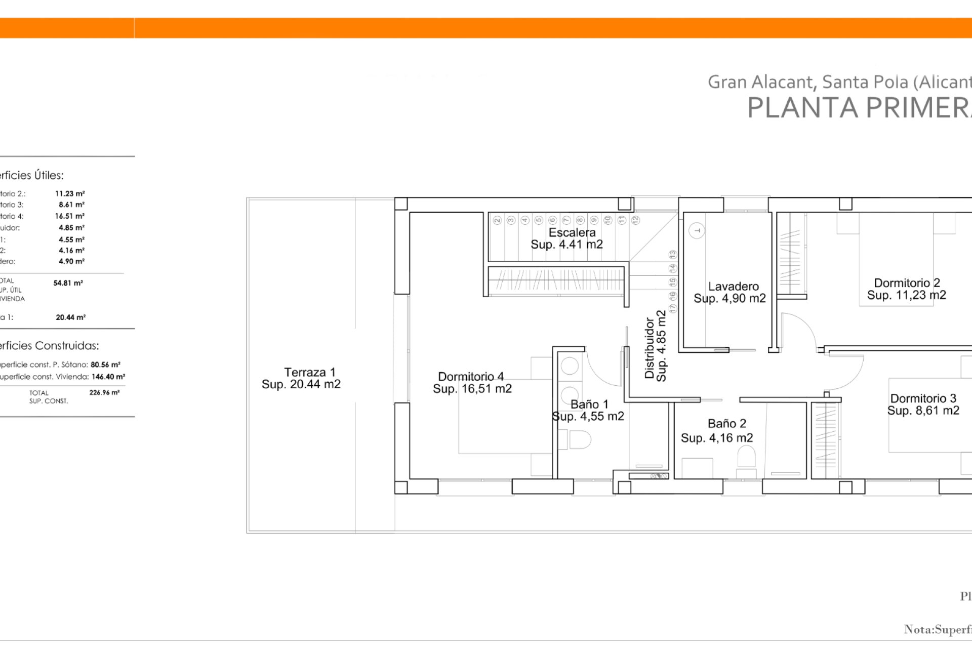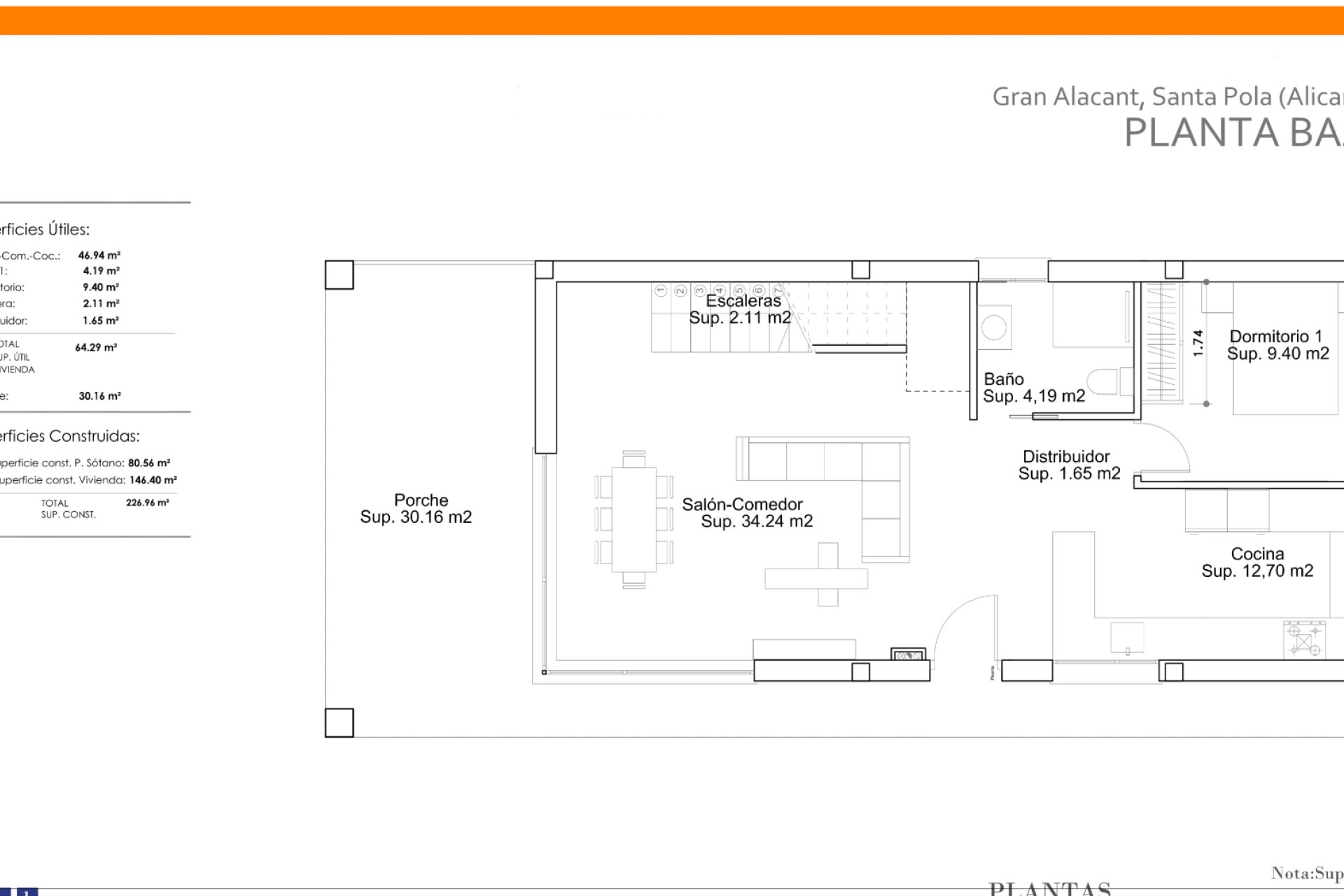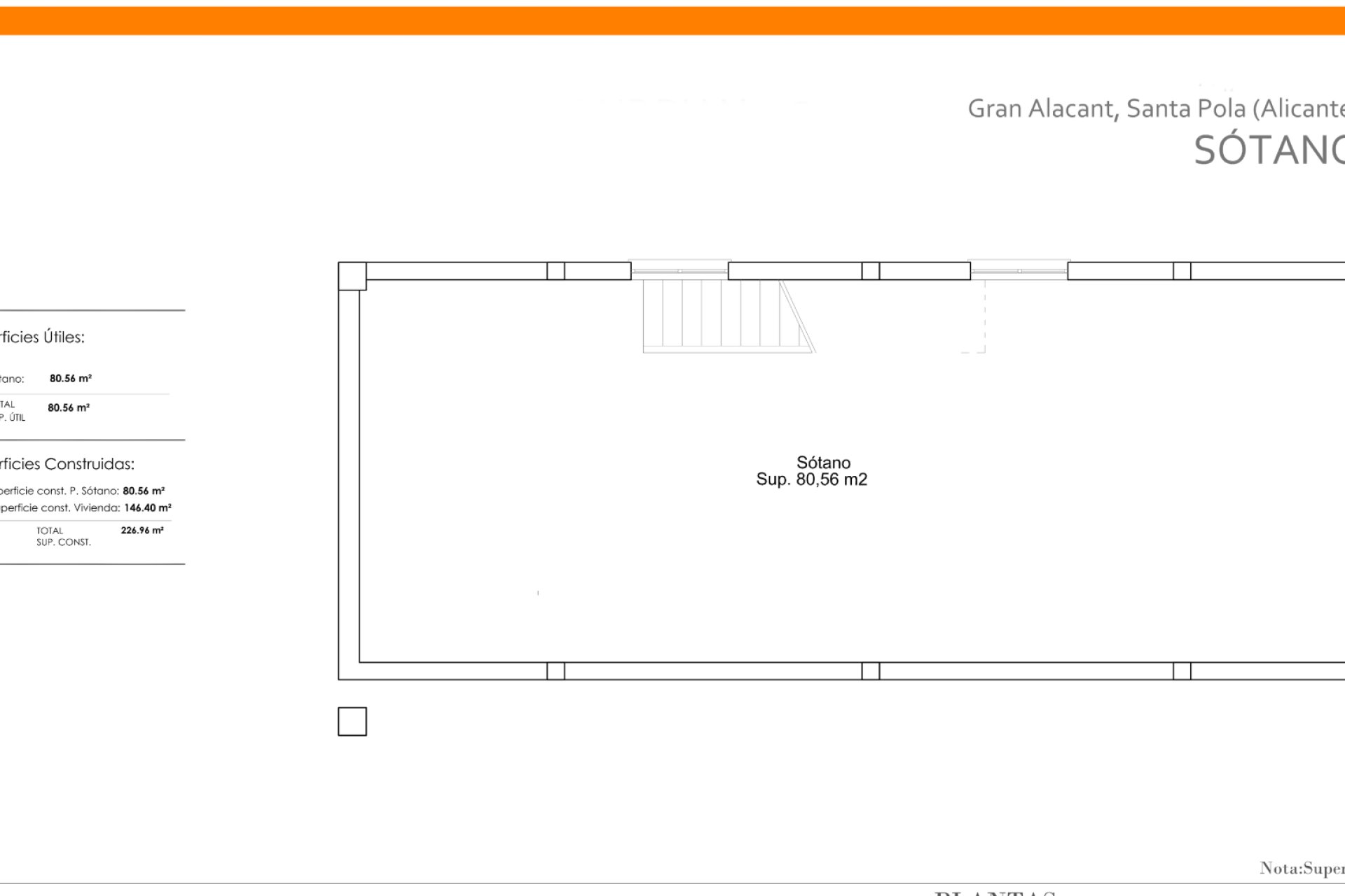 Nieruchomość jest rozmieszczona na dwóch piętrach, z 4 sypialniami, 3 łazienkami i kuchnią na otwartym planie połączoną z salonem. Posiada również duży taras na pierwszym piętrze. Na parterze znajduje się weranda, która pozwala cieszyć się dobrą pogodą na zewnątrz, która charakteryzuje obszar Gran Alacant.