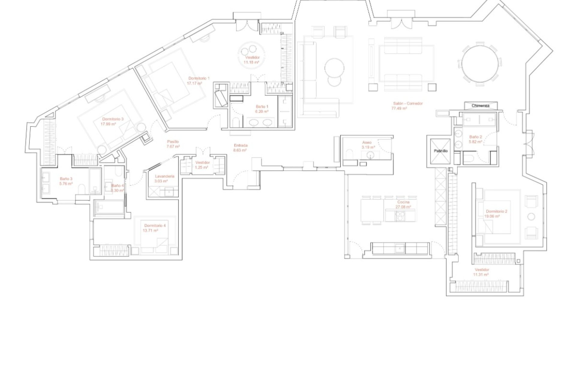 Całkowicie odnowiona nieruchomość o powierzchni około 431 m², podzielona na 4 sypialnie i 5 łazienek, położona na piątym piętrze, w dzielnicy Castellana, w dzielnicy Salamanca.