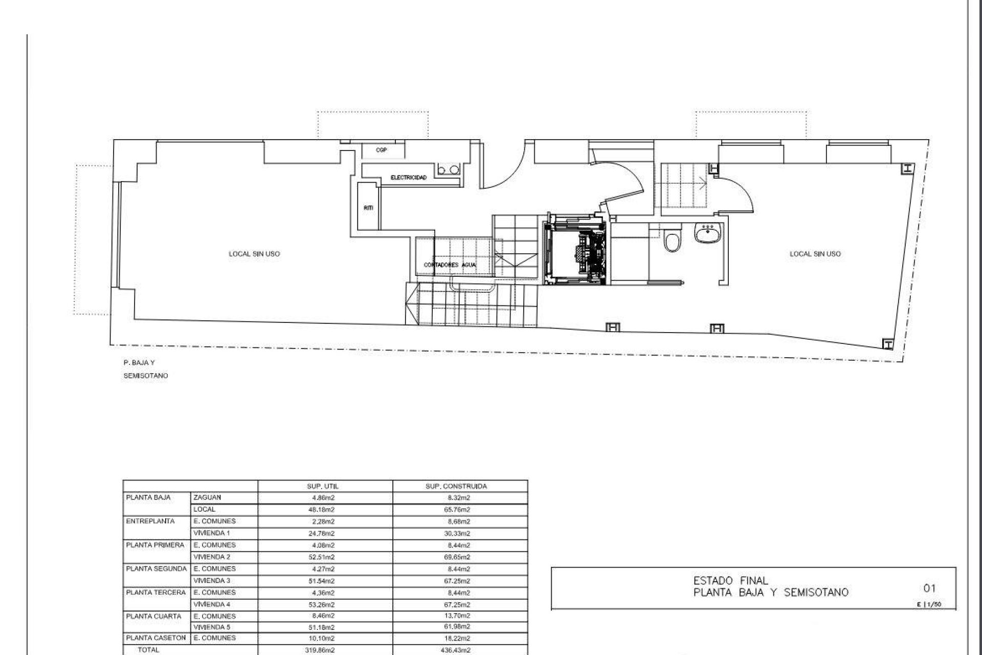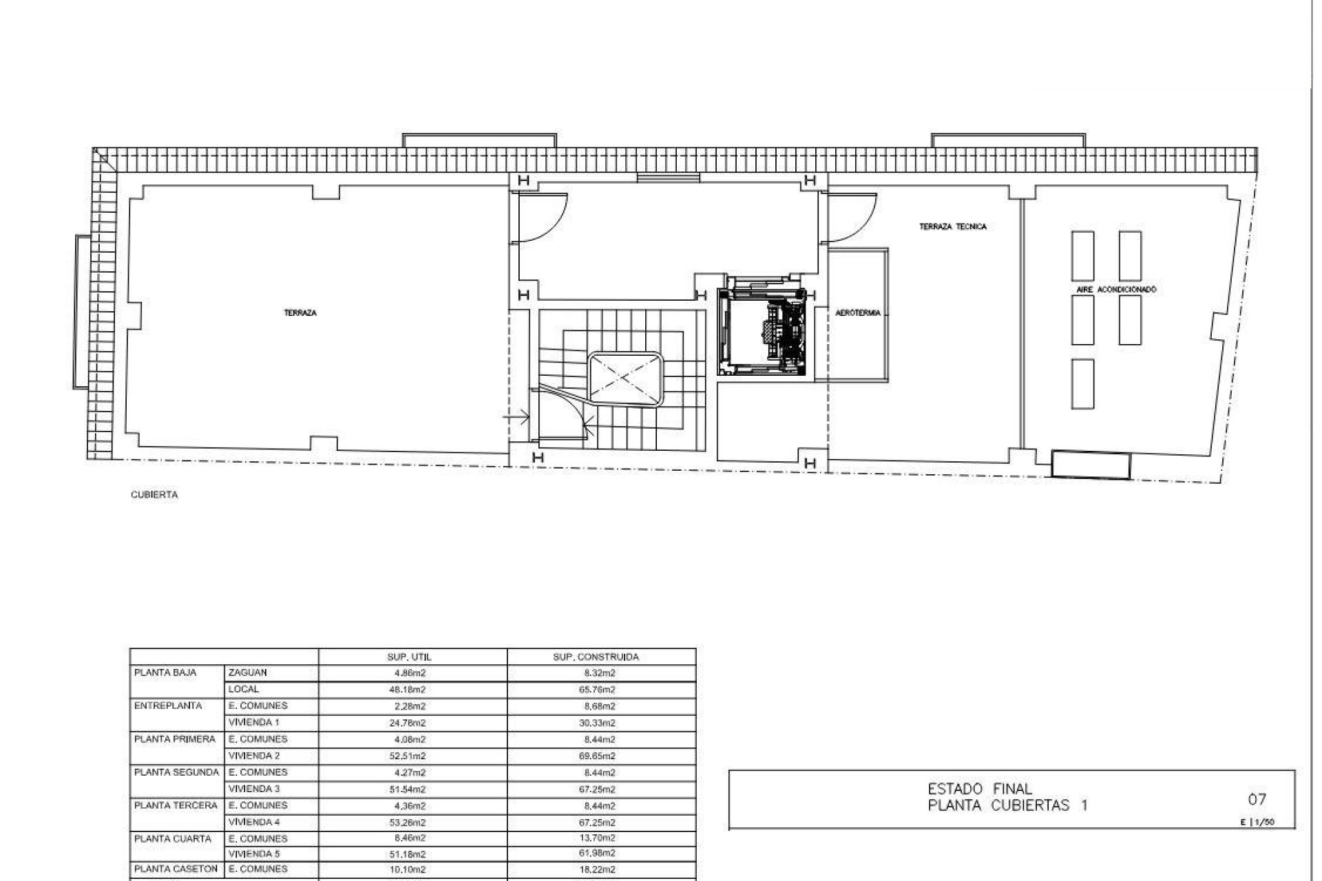 A ground-level elevator provides access to all floors, reaching the fifth-floor communal terrace and utility area equipped with air conditioning, aerothermal system, and a central heating boiler.