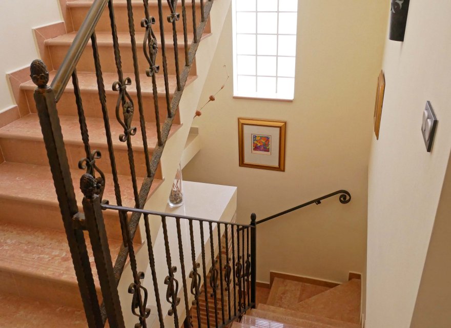 Absolutely stunning 6 bedroom detached villa built on a large plot with a private pool for sale in El Chaparral close to Torrevieja. From the street the property is accessed either by a pedestrian door or a wide, sliding gate for vehicles. Inside the gate there is an outdoor parking area as well as a garage. Entering the villa we are met by the spacious open plan kitchen. The kitchen has been completely renovated with top quality appliances as well as work tops in granite and bright, shiny, white wall mounted and floor standing kitchen cabinets. Moving through the kitchen we arrive into the bright lounge with access to the upper floors, the lower bathrooms, bedrooms and another lounge overlooking the pool, which is ideal for large dinner parties. Moving up the stairs we are met by a wide spacious passage with access to four more bedrooms and three more bathrooms. There are two more rooms on the second floor, currently used as office and storage. Moving up one more level, we are met by the large solarium providing stunning views over the salt lake. Moving outside to the tiled pool area, we find a bar with roof, ideal for parties and barbecues. Close to the pool there is an independent bathroom. . The villa is in excellent condition, renovated with top quality materials and fitted with modern lights and appliances. PROPERTY FEATURES: Bedrooms: 6 Bathrooms: 6 Builds: 256m2 Plot: 1.023m2 Distance to beach: 10 min. Distance to airport: 35 min. Distance to amenities: 2 min. Distance to Golf: 15 min. Balcony Open Plan Kitchen Swimming Pool Garden Solarium Garage Lounge Close to services Dining Room Tiled terrace Air Conditioning Central Heating Scenic Views Part Furnished Our La Siesta sales office are proud to offer for sale this Beautiful, luxury villa which is conveniently situated close to shops, bars, restaurants, supermarkets, etc. the golden sandy beaches of the Costa Blanca, Costa Calida & the Mar Menor are only 15 minutes away, and is close to all main transport links, with just a 35 minute drive to Murcia (San Javier) or 35 minute drive Alicante airports and only minutes from any of a dozen world class golf courses. Because of its proximity to the golden sandy beaches of the Costa Blanca, Orihuela Costa, Costa Calida and the Mar Menor, not to forget all those world-famous golf courses means that should you buy this wonderful property, not only will you have a fabulous investment, with its increased rental and growth potential but you will also have everything you might ever need to enjoy your life in the Spanish sunshine. This Villa is for sale part furnished and it has been priced to sell so an early viewing is highly recommended!