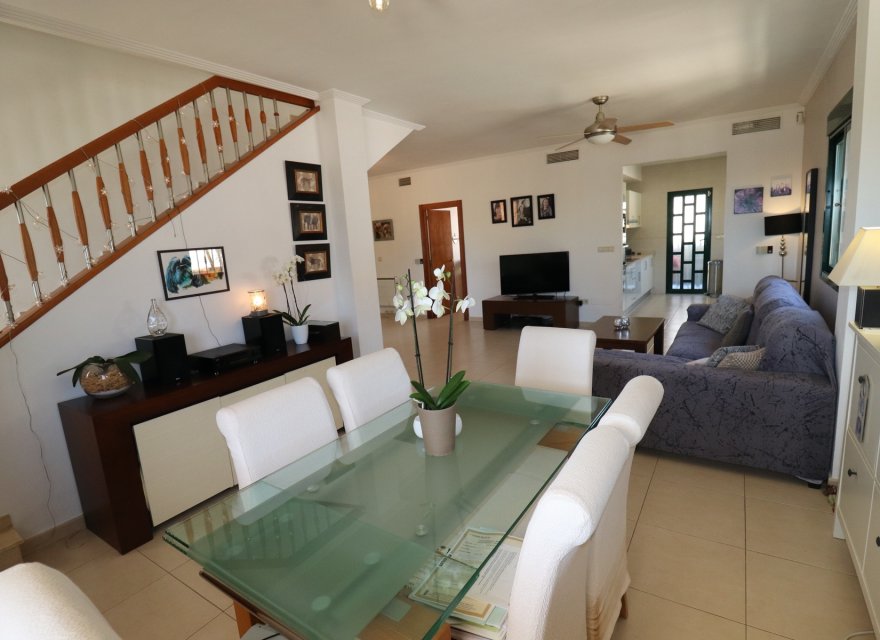On entrance this is a 4 bed villa arranged across 2 floors, accessed from a large front terrace. On the ground floor we have a modern and bright living space, here the large and modern kitchen, dining and living space offers plenty of room to arrange a layout of these areas as suits your needs. Here also we have the Master bedroom with en suite and 2 double size bedrooms with fitted wardrobes, and a family bathroom, also some additional separate storage space, and outside separate from the kitchen a additional utility or laundry room. On the 2nd floor there is a further 4th bedroom, and this has double access to the terraces/solarium of the property facing forwards towards the Salt lakes and at the rear across Quesada. On this floor also there is an additional room, currently used as an office but equally could be a 5th bedroom or any space that you would prefer.