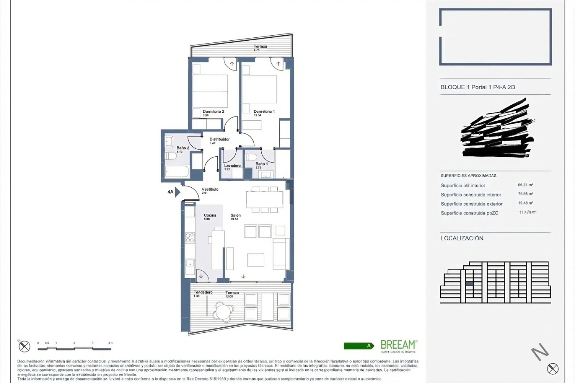 This elegant apartment offers 95 m² built and 80 m² usable, featuring a spacious living-dining area with an open-plan kitchen fully fitted with premium appliances. Large floor-to-ceiling windows flood the space with natural light, creating a bright and welcoming atmosphere. The property includes two double bedrooms with built-in wardrobes and two full bathrooms, one of them en suite in the master bedroom. It also has two terraces, one facing southwest with views over the community and another northeast-facing with views of the central park.