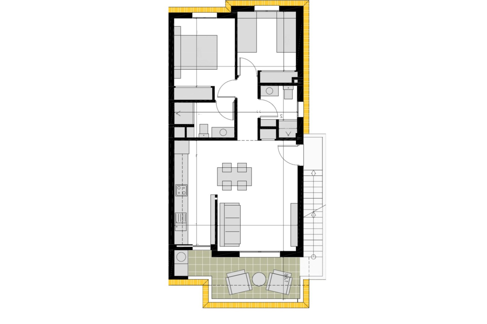 Additionally, there is a terrace on the ground floor. Built in 2017-2018, the apartment showcases a bright and contemporary design. It includes a designated parking space in the community garage.
