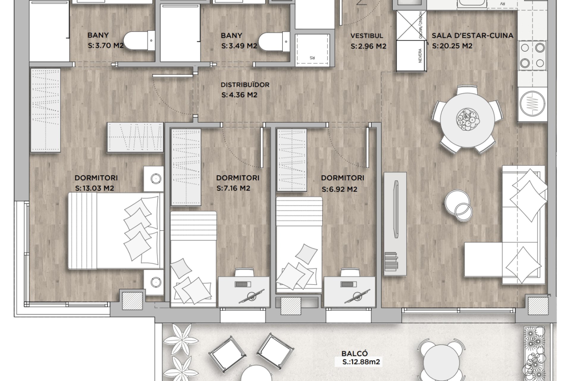 Квартиры отличаются высоким уровнем комфорта, энергоэффективностью и экологичностью. Все помещения имеют рейтинг A по энергосертификату и оснащены системой экономии воды. Кухни оборудованы столешницами Neolith и техникой Siemens или аналогичного класса. В ванных комнатах используется сантехника Roca и Krion. Напольное покрытие — износостойкий виниловый паркет, а отопление и охлаждение осуществляется через современную аэротермальную систему. Каждый элемент интерьера продуман для обеспечения максимального уюта и функциональности.