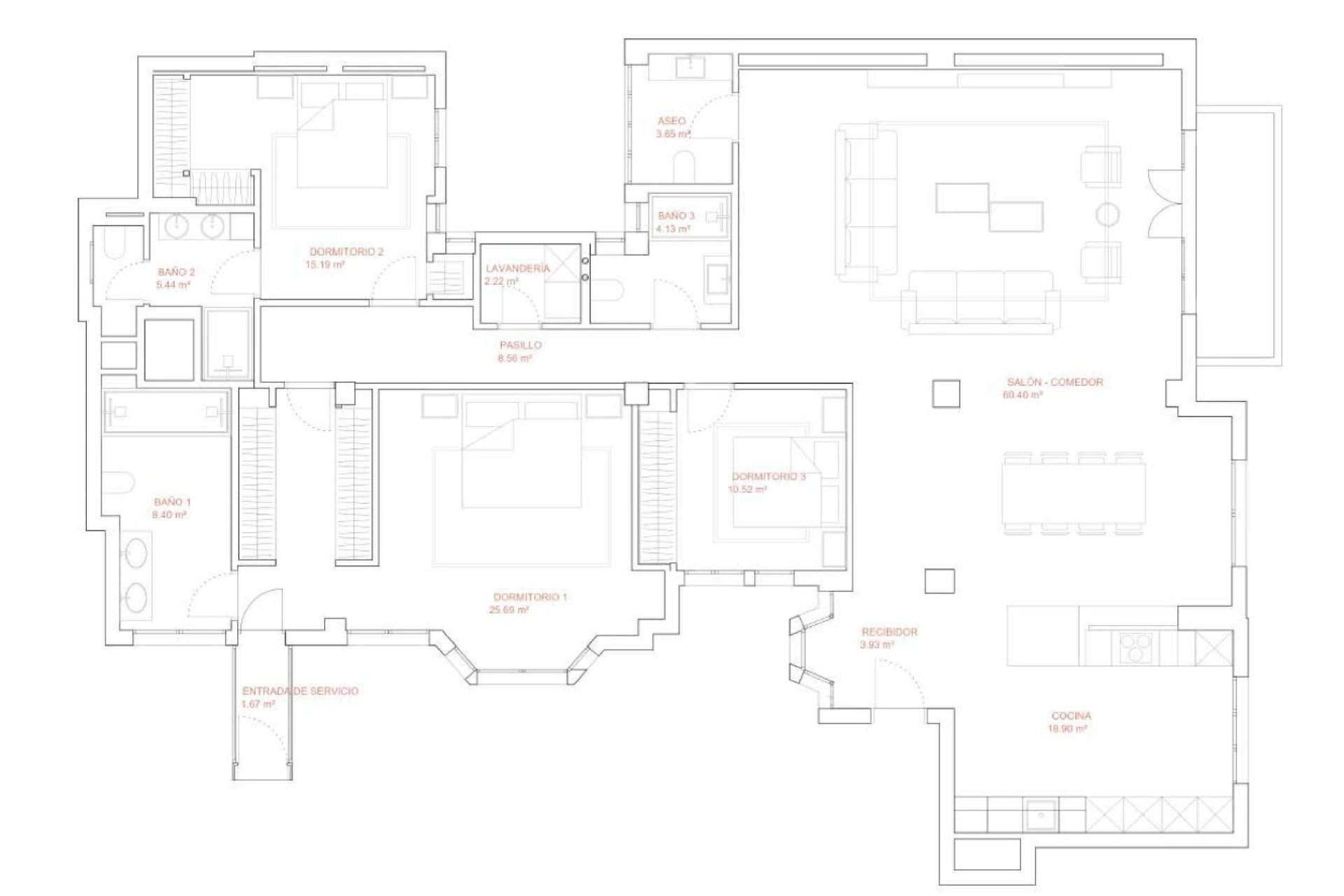 Полностью отремонтированная и меблированная квартира площадью около 232 м2, разделенная на 3 спальни и 4 ванные комнаты, расположенная на четвертом этаже, в микрорайоне Жеронимос, в районе Ретиро.